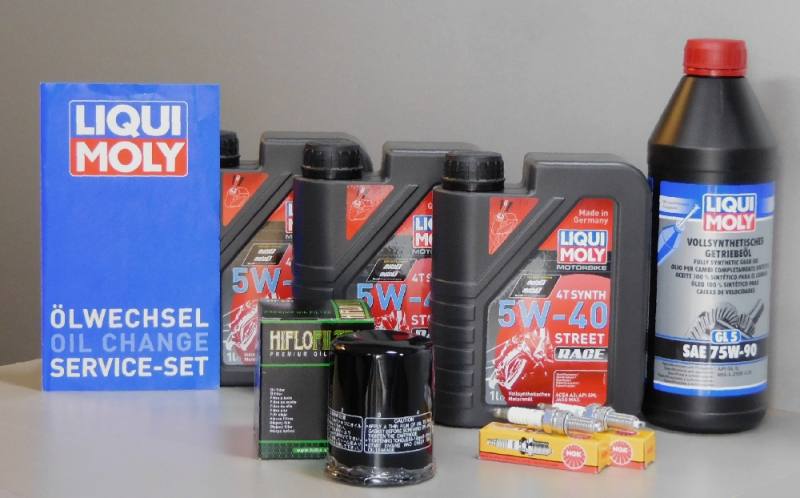 Serviceset für die einfache Wartung, besteht aus: 3 Liter - LiquiMoly Motorenöl 4T 5W-40 Street, Synthese Technologie API SL / Jaso MA2 1 Liter Liqui Moly Getriebeoel, SAE 75W-90 Racing API GL5 / MIL-L-2105 C/D 2x Zündkerze von NGK passend zum Fahrzeug 1x Ölfilter von HiFlo passend zum Fahrzeug 1x Oelwechsel Service-Set von Liqui Moly Dieses Set besteht ausschließlich aus Qualitätsprodukten und sichert den Erhalt des Fahrzeuges. Shop Nr.: 99/ACHav1000/01 Wir bieten alles rund um: Quads/ATV - Roller - Motorräder - Trikes - Kraftfahrzeuge Service - Ersatzteile - Reparaturen - Zubehör Altoelverordnung: Gemäß der Altölverordnung sind wir verpflichtet folgende gebrauchte Öle kostenlos zurückzunehmen: – Öle aus Verbrennungsmotoren – Getriebeöle – Ölfilter und bei einem Ölwechsel regelmäßig anfallende ölhaltige Abfälle. Sie können das Altöl in der Menge bei uns zurückgeben, welcher der bei uns gekauften Menge entspricht. Sie können die Öle dort jederzeit während unserer Öffnungszeiten abgeben. Sie können uns das gebrauchte Öl und die ölhaltigen Stoffe auch zu senden, die dafür entstehenden Versandkosten sind hierbei von Ihnen zu tragen. Bitte beachten Sie, daß für Altöl besondere Transportbedingungen gelten können. Wir weisen außerdem darauf hin, daß unsere Annahmestelle über eine Einrichtung verfügt, die es ermöglicht, den Ölwechsel fachgerecht durchzuführen sowie die ölhaltigen Stoffe gemäß Altölverordnung zu entsorgen. Falls Sie ein gewerblicher Endverbraucher sind, weisen wir darauf hin, daß wir uns Ihnen gegenüber zur Erfüllung unserer Annahmepflichten Dritter bedienen können. ®