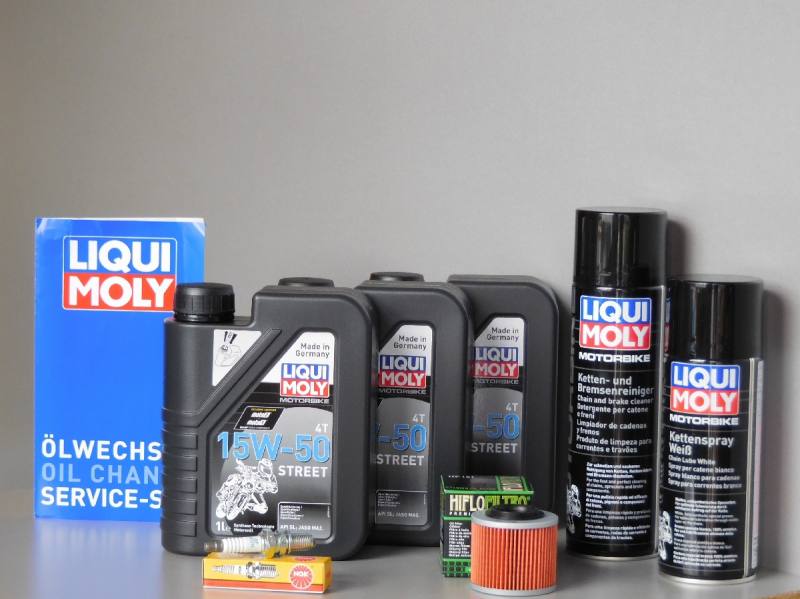 Wartungskit für den Service, passend für: BMW F 650 CS Scarver 2002-2005 Serviceset für die Wartung, besteht aus: 3 Liter - Liqui Moly Motorenöl 15W-50 Street 4T Synthese Technologie API SL / Jaso MA2 1x Ölfilter von Hiflofiltro passend zum Fahrzeug 1x Zündkerze von NGK passend zum Fahrzeug 1x Kettenreiniger Racing 500 ml Spraydose von LiquiMoly 1x Kettenfett Racing weiß 400 ml Spraydose von LiquiMoly 1x Ölwechselset von LiquiMoly