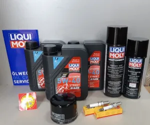 Wartungskit für den Service, passend für: BMW F 900 GS Serviceset für die Wartung, besteht aus: 1x 3 Liter - Liqui Moly Motorenöl 5W-40 Street Race 4T Synthese Technologie API SL / Jaso MA2 1x 400ml Liqui Moly Motorbike Kettenspray weiß 1x 500ml Liqui Moly Motorbike Ketten- und Bremsenreiniger 1x Ölfilter in Erstausrüsterqualität passend zum Fahrzeug 2x Zündkerze von NGK passend zum Fahrzeug 1x Ölwechselset von LiquiMoly 1x Servicemarke von MotorFunSports ® 99/BMW-F9G/01