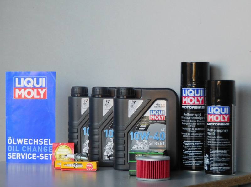 Serviceset für die Wartung, besteht aus: 3 Liter - Liqui Moly Motorbike 4T 10W-40 Street 2x Zündkerzen von NGK passend zum Fahrzeug 1x Ölfilter von HiFlo passend zum Fahrzeug 1x 400 ml Liqui Moly Motorbike Kettenspray weiß 1x 500 ml Liqui Moly Motorbike Ketten- und Bremsenreiniger 1x Ölwechselset von LiquiMoly 1x Original Servicemarke von MotorFunSports