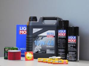 Serviceset für die Wartung, besteht aus: 4 Liter - Liqui Moly Motorenöl 10W-40 Street 4T Synthese Technologie API SL / Jaso MA2 4x Zündkerze von NGK passend zum Fahrzeug 1x Ölfilter von Hiflofiltro passend zum Fahrzeug 1x 400 ml Liqui Moly Motorbike Kettenspray weiß 1x 500 ml Liqui Moly Motorbike Ketten- und Bremsenreiniger 1x Ölwechselset von LiquiMoly 1x Original Servicemarke von MotorFunSports