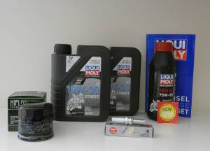 Wartungskit für den Service, passend für: Honda SH 350 Serviceset für die Wartung, besteht aus: 2 Liter Liqui Moly Motorenöl Racing Street 10W-30 Syn. Technologie API SL, JASO MA2 1x Zündkerze von NGK passend zum Fahrzeug 1x Ölfilter passend zum Fahrzeug 1x 500 ml Liqui Moly Motrobike Gear Oil 75W-90 1x Ölwechselset von LiquiMoly 1x Servicemarke von MotorFunSports