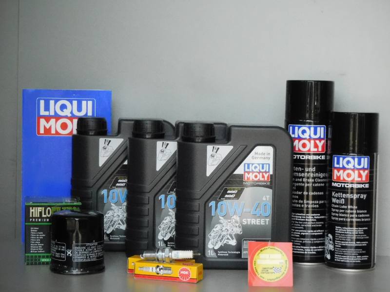 Serviceset für die Wartung, besteht aus: 3 Liter - Liqui Moly Motorenöl 10W-40 Street 4T Synthese Technologie API SL / Jaso MA2 2x Zündkerzen von NGK passend zum Fahrzeug 1x Ölfilter von HiFlo oder Hifi in Erstausrüsterqualität passend zum Fahrzeug 1x Kettenreiniger von Liqui Moly in der 500ml Spraydose 1x Kettenspray von Liqui Moly in der 400ml Spraydose 1x Ölwechselset von LiquiMoly 1x Original Servicemarke von MotorFunSports Dieses Set besteht ausschließlich aus Qualitätsprodukten und sichert den Erhalt des Fahrzeuges.