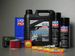 Wartungskit für den Service, passend für: Kawasaki GPX 750 R Serviceset für die Wartung, besteht aus: 4 Liter - Liqui Moly Motorenöl 10W-40 Street 4T Synthese Technologie API SL / Jaso MA2 1x Ölfilter von Hiflofiltro passend zum Fahrzeug 4x Zündkerze von NGK passend zum Fahrzeug 1x Kettenreiniger Racing 500 ml Spraydose von LiquiMoly 1x Kettenfett Racing weiß 400 ml Spraydose von LiquiMoly 1x Ölwechselset von LiquiMoly