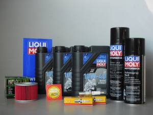 3 Liter - Liqui Moly Motorenöl 10W-40 Basic Street 4T Synthese Technologie API SL / Jaso MA2 400 ml Liqui Moly Motorbike Kettenspray weiß 500 ml Liqui Moly Motorbike Ketten- und Bremsenreiniger 2x Zündkerzen von NGK passend zum Fahrzeug 1x Ölfilter von HiFlo passend zum Fahrzeug 1x Ölwechselset von LiquiMoly 1x Original Servicemarke von MotorFunSports