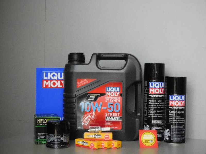 4 Liter - Liqui Moly Motorenöl 10W-50 Street Race 4T Synthese Technologie API SL / Jaso MA2 4x Zündkerze von NGK passend zum Fahrzeug 1x Ölfilter von HiFlo passend zum Fahrzeug 1x Kettenreiniger von Liqui Moly in der 500ml Spraydose 1x Kettenspray von Liqui Moly in der 400ml Spraydose 1x Ölwechselset von LiquiMoly 1x Original Servicemarke von MotorFunSports
