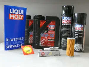 KTM EXC-F 450 Serviceset für die Wartung, besteht aus: 1x Ölfilter von HiFlo passend zum Fahrzeug 1x Zündkerzen von NGK passend zum Fahrzeug 2x Liter – LiquiMoly Motorenöl Motorbike 4T Synth 10W-50 Street Race 1x 400 ml LiquiMoly Motorbike Kettenspray weiß 1x 500 ml LiquiMoly Motorbike Ketten- und Bremsenreiniger 1x Ölwechselset von LiquiMoly 1x Original Servicemarke von MotorFunSports