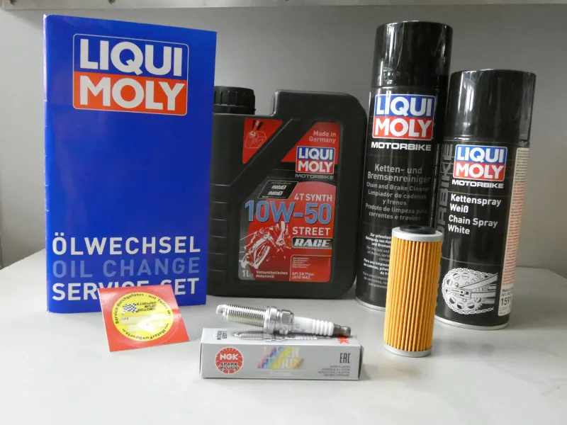 KTM SX-F 350 ab 2016 Serviceset für die Wartung, besteht aus: 1x Ölfilter von HiFlo passend zum Fahrzeug 1x Zündkerzen von NGK passend zum Fahrzeug 1x Liter – LiquiMoly Motorenöl Motorbike 4T Synth 10W-50 Street Race 1x 400 ml LiquiMoly Motorbike Kettenspray weiß 1x 500 ml LiquiMoly Motorbike Ketten- und Bremsenreiniger 1x Ölwechselset von LiquiMoly 1x Original Servicemarke von MotorFunSports