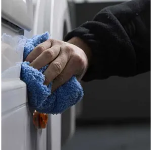 Verwende das trockene Microfasertuch mit leichtem Druck und kreisenden Bewegungen, um Rückstände von Pflegemitteln oder Polituren streifenfrei zu entfernen.